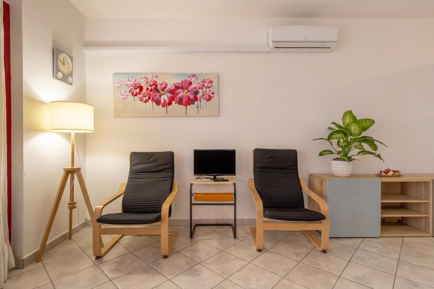 Appartamento con 1 Camera da Letto e Vista Giardino. Boasting a private entrance, this air-conditioned apartment comes with 1 living room, 1 separate bedroom and 1 bathroom with a shower. Guests can make meals in the fully equipped kitchen that has a dishwasher, kitchenware and a microwave. Featuring a terrace with garden views, this apartment also features a washing machine and a TV with cable channels. The unit has 3 beds.